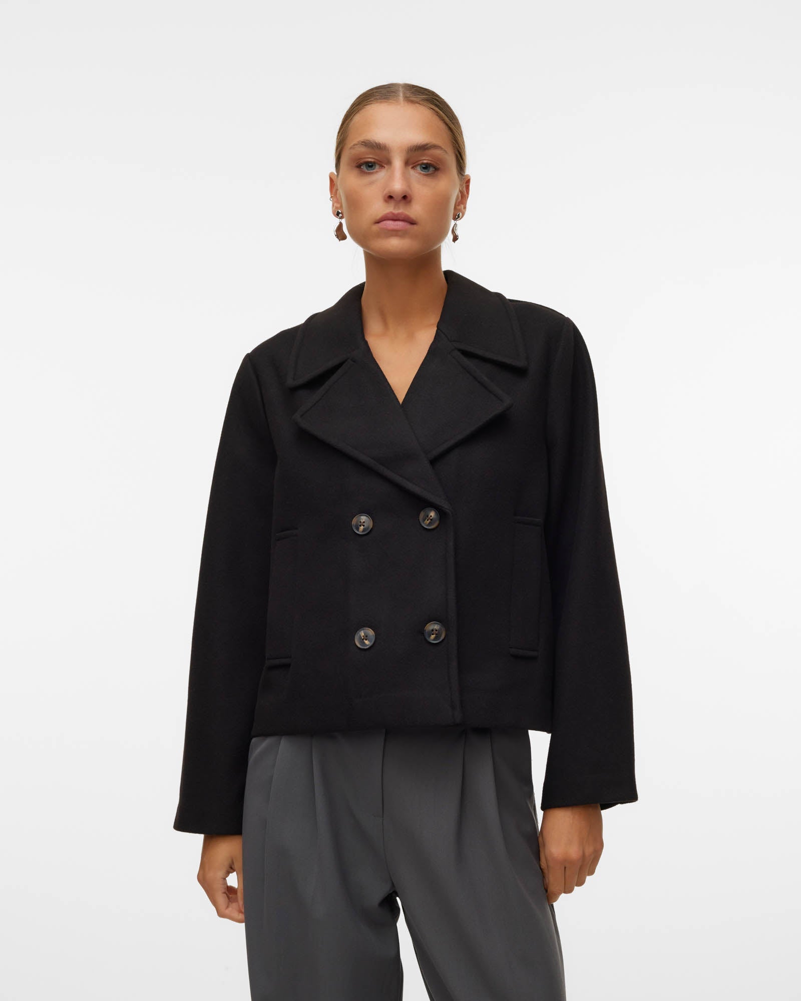 • Cropped length with a wide collar and double-breasted buttons for timeless style